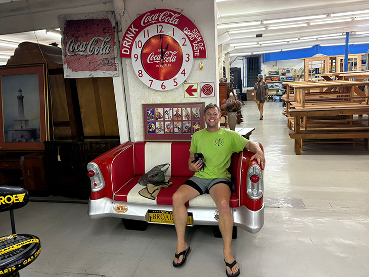 Mossel Bay'da bir kafede: 1956 model chevrolet otomobilin bagaj bölümü koltuk haline getirilmiş.