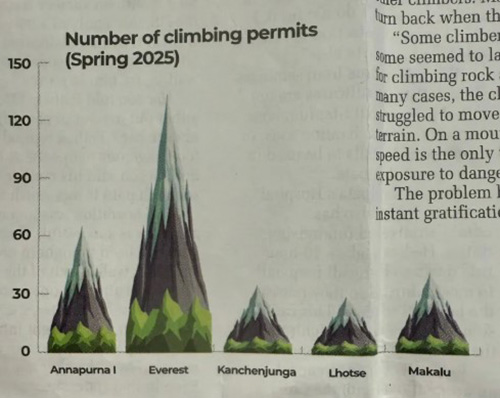 Toplam 14 adet 8.000 metre üzeri dağdan 8’i Nepal’de bulunuyor. Bu nedenle ülke, dağcıların “kutsal mekânı” sayılıyor. Nepal turizminin en önemli kaynağı bu dağlar, medyada da en fazla bu dağlar konu ediliyor, kim çıkmış, ne zaman çıkmış, nereden, nasıl çıkmış. Sürdürülebilirlik konusu bile bu dağların aldığı yağış miktarı üzerinden tartışılıyor. Himalayalar, Asya’nın iklimini düzenleyen en önemli doğal bariyerlerden biriymiş. Aynı zamanda su kaynakları açısından milyarlarca insanın yaşamını etkiliyor. Bakın gazetelerden birinde gözüme çarpan bir tablo. Bahar ayında dağcıların hangi dağlara çıkmak için daha fazla izin aldıklarının özeti: