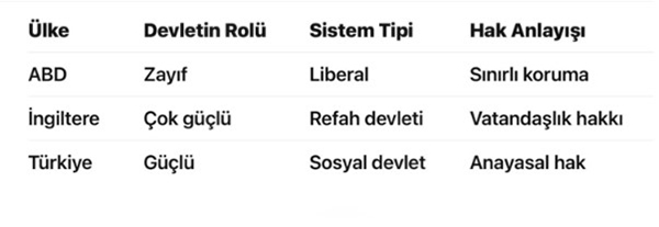 Kısaca ABD bireyi, İngiltere devleti, Türkiye ise anayasal sosyal dengeyi merkeze alır.