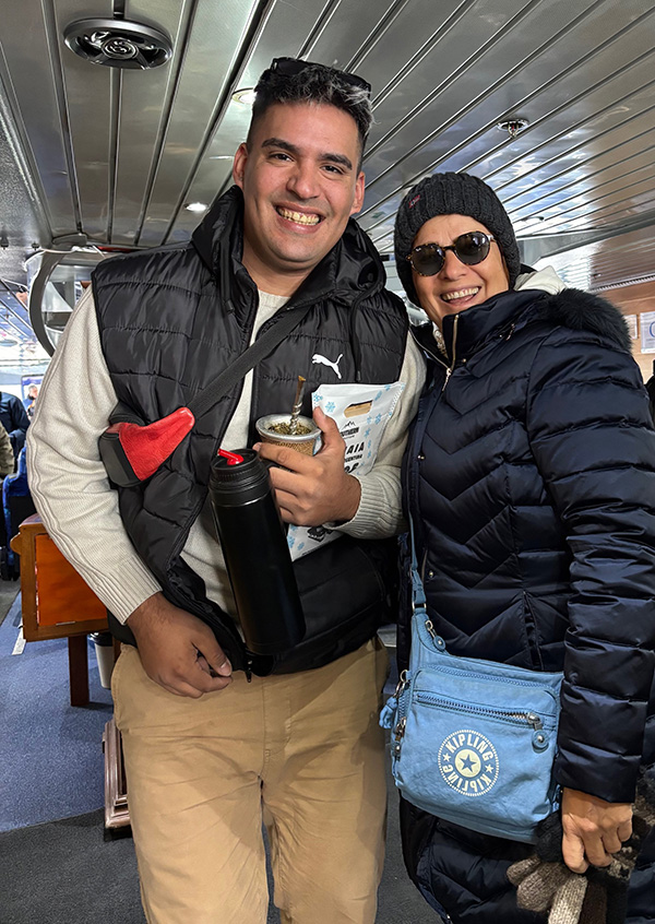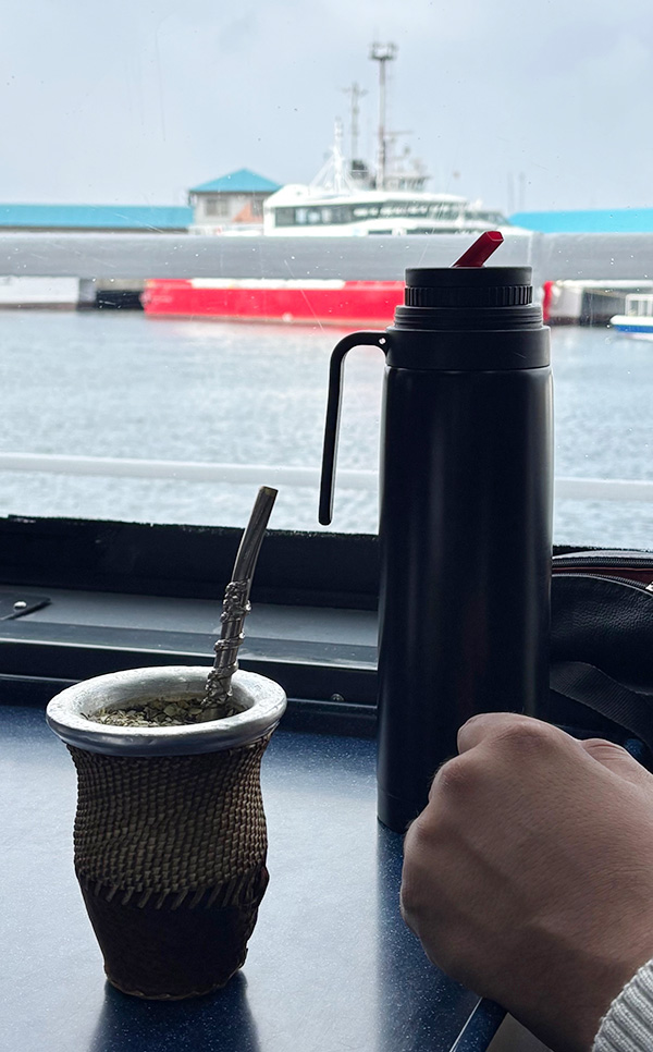 Limandaki fotoğraf noktasında fotoğraflarımızı çektikten sonra katamarana binip, alt bölüme yerleşiyoruz. Bizden başka farklı turist grupları da geziye katılıyor. Benim oturduğum masanın bir ucunda, cam kenarında, Arjantinli sempatik bir genç oturuyor ve önündeki kupadan (bombilla), filtreli metal bir pipetle mate çayı içiyor.